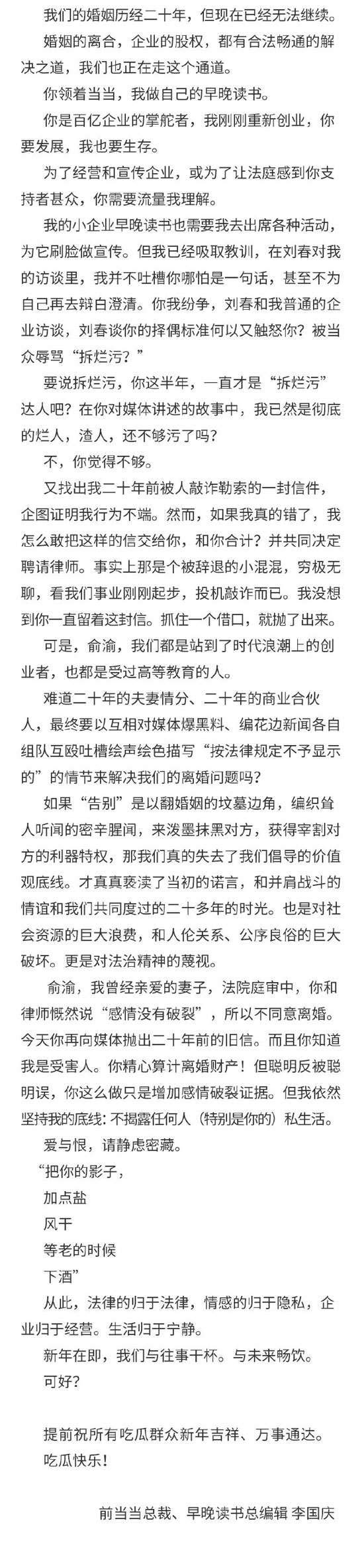 俞渝在公開信中表示,劉春12月1號,請李國慶去鳳凰會客廳,用拆爛污的話題,再次送他上熱搜,太過分了!李國慶謊話連篇,你的確是他哥們,但請保留媒體人的基本訓練。對此,李國慶表示,看了你給劉春的公開信。既然又污蔑誹謗我,我只好回應。