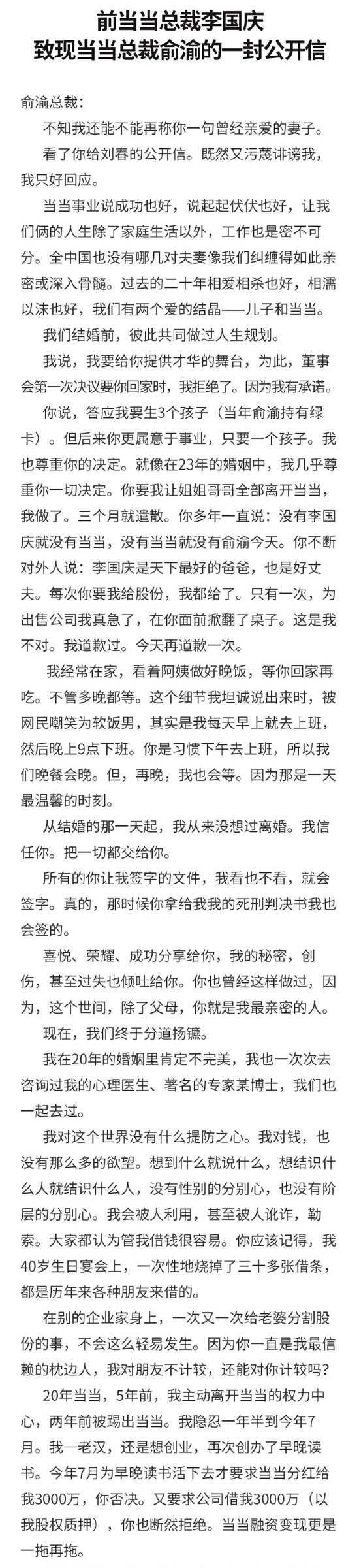 針對當當網(wǎng)CEO俞渝發(fā)布致鳳凰網(wǎng)高級副總裁劉春的公開信,李國慶晚間也發(fā)布公開信稱,難道二十年的夫妻情分、二十年的商業(yè)合伙人,最終要以互相對媒體爆黑料、編花邊新聞各自組隊互毆吐槽繪聲繪色描寫“按法律規(guī)定不予顯示的”的情節(jié)來解決我們的離婚問題嗎?