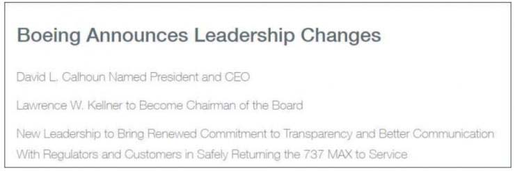 “在公司新領(lǐng)導(dǎo)層的領(lǐng)導(dǎo)下,波音將重新承諾做到全面透明,包括與美國聯(lián)邦航空管理局、其他全球監(jiān)管機(jī)構(gòu)及其客戶進(jìn)行有效和積極的溝通。”