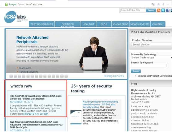(ICSAlabs網(wǎng)站首頁發(fā)布H3C SecPath全系列防火墻認(rèn)證聲明)