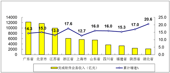 主要軟件大省保持穩(wěn)中向好態(tài)勢,部分中西部省市快速增長。軟件業(yè)務收入居前5名的廣東、北京、江蘇、浙江、上海共完成收入45623億元,占全國軟件業(yè)比重的63.6%。軟件業(yè)務收入增速高于全國平均水平的省市有16個,其中增速高于20%的省份集中在中西部地區(qū),包括廣西、云南、貴州、寧夏、安徽、江西、湖南等省份。