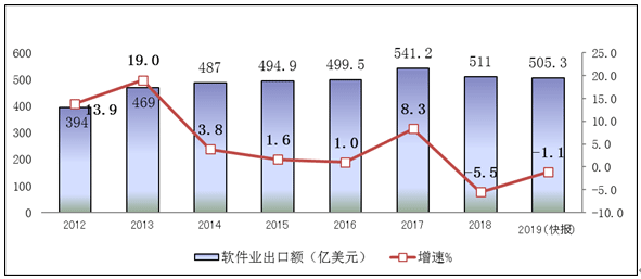 軟件出口形勢低迷。2019年,全國軟件和信息技術(shù)服務業(yè)實現(xiàn)出口505.3億美元,同比下降1.1%。