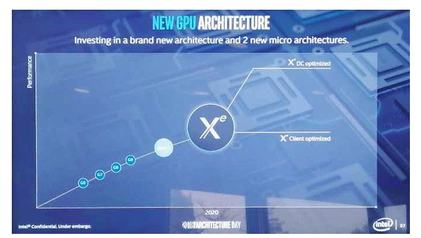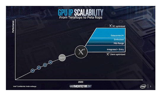 英特爾實際上對這個市場進行了細分,這表明Xe也涵蓋了未來的集成顯卡解決方案。如果從這張幻燈片判斷,英特爾似乎希望Xe覆蓋從入門級到中檔、再到發(fā)燒友、再到人工智能等諸多領域,與競爭對手最好的產(chǎn)品競爭。