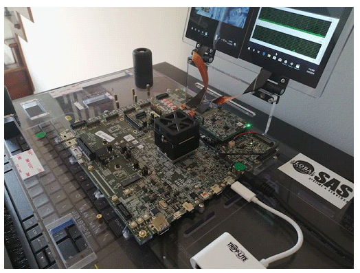 英特爾展示的演示系統(tǒng)看起來與以前的Sunny Cove設計相似,但是這個散熱器更小,并且有幾個不同的連接器。我們被告知這個芯片將支持PCIe for M.2以及UFS,這兩者都可以在移動設備上找到。這塊主板上也有幾個SIM卡連接器。