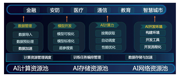 一是提供極致高性能的AI計算資源,實(shí)現(xiàn)高效的計算力支撐、精準(zhǔn)的資源管理和調(diào)度、敏捷的數(shù)據(jù)整合及加速、流程化的AI場景及業(yè)務(wù)整合。管理人員可以通過界面化視圖實(shí)時掌握資源使用情況及運(yùn)行狀態(tài),采用靈活的資源調(diào)度策略。支持容器技術(shù),最大化提高資源使用率,實(shí)現(xiàn)彈性擴(kuò)展。模型訓(xùn)練時數(shù)據(jù)可下載到本地節(jié)點(diǎn),加快了模型訓(xùn)練速度。AI開發(fā)全流程簡化操作,提高了效率。