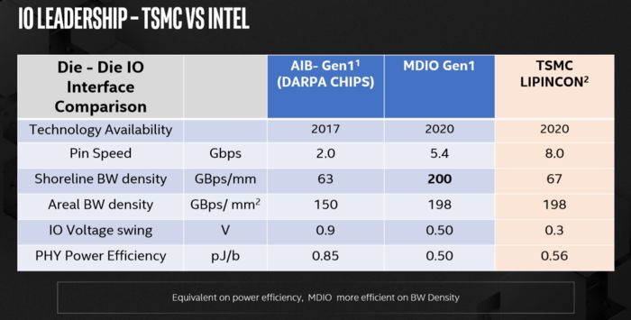更進一步的,英特爾還發(fā)布了全新 MDIO技術。簡單地說,MDIO是一種性能更好的芯片到芯片之間的接口(針腳)技術。相對于之前英特爾所使用的AIB(高級接口總線)技術,MDIO能夠在更小的連接面積內(nèi)實現(xiàn)更高的數(shù)據(jù)帶寬。這樣,即便是使用ODI技術中更細的針腳也能夠滿足芯片之間數(shù)據(jù)帶寬的需求(因為針腳密度提升,所以針腳勢必會變得更細、更密集,每根針腳的電氣性能也會因此受到影響,所以MDIO技術的關注點便是如何在布置更密集針腳的同時保證互聯(lián)性能和電氣性能)。