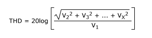 總諧波失真(THD):出現(xiàn)在輸入(DAC為輸出)頻率整數(shù)倍頻點(diǎn)(諧波)的失真的RMS值與輸入(或輸出)正弦波的RMS值之比。測(cè)量中僅包括奈奎斯特頻限內(nèi)的諧波,典型值以分貝表示: