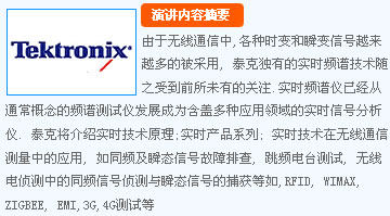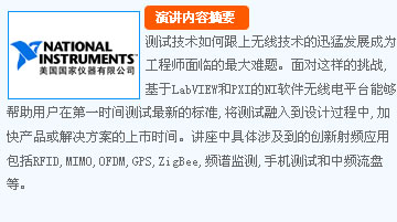 當今世界正在向“溝通無處不在,無時不有”的方向演變,無線通信新技術(shù)新應用給工程師的開發(fā)和測試帶來了巨大的挑戰(zhàn):如何選擇滿足新標準的測試儀器?如何應對多種無線通信標準的并存?如何降低測試成本?如何采取自動化測試來縮短測試時間,以加快產(chǎn)品上市?基于此,2009無線通信測試技術(shù)研討會即將舉辦,屆時國內(nèi)外領(lǐng)先測試測量廠商、技術(shù)專家將帶來多場精彩演講,滿足工程師們迫切希望獲得的最新測試技術(shù)、具體測試方案以及能滿足測試需求的測試儀器的相關(guān)信息。