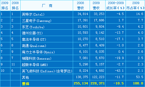 2008年大幅衰退,導(dǎo)致廠商在2009年快速調(diào)整供貨以因應(yīng)2009年的市況,結(jié)果使得DRAM和NAND 閃存的價格走高。再加上,三星在技術(shù)上的領(lǐng)先地位和財務(wù)穩(wěn)定,亦使其營收出現(xiàn)成長。 |