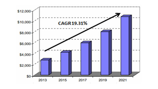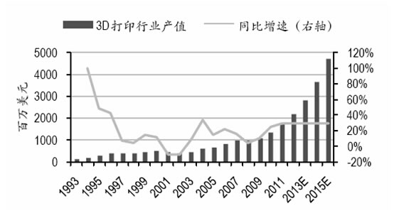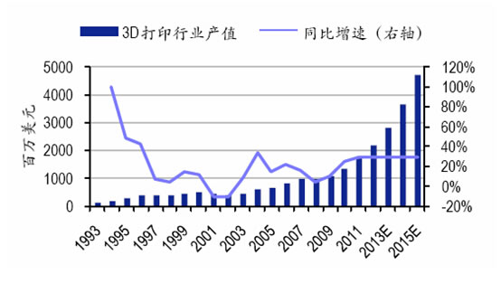 1993-2015年全球3D打印市場規(guī)模預測:億美元