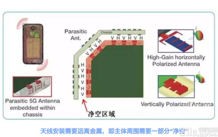 對(duì)于全面屏手機(jī),由于上下邊框變得更窄,天線與金屬中框的距離更近,“凈空”比傳統(tǒng)屏幕更少。另外全面屏手機(jī)的受話器、攝像頭等器件需要更高的集成度,與天線的距離也更近,給天線留下的“凈空”區(qū)域比傳統(tǒng)屏幕更少。