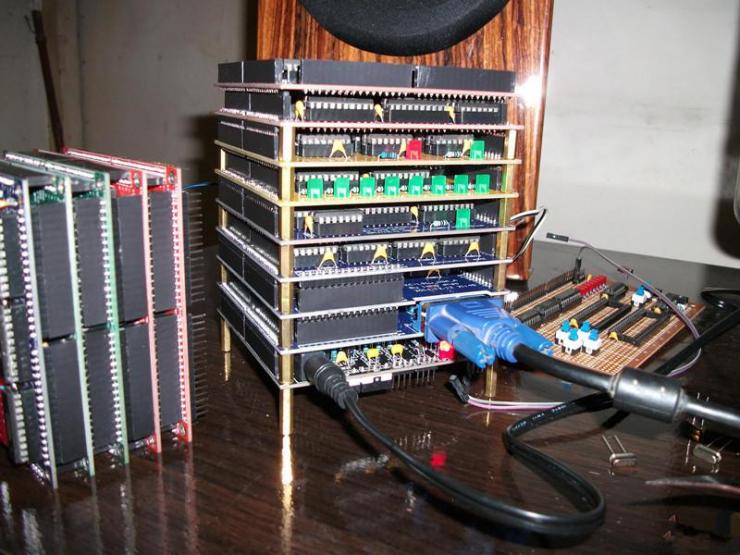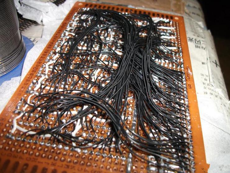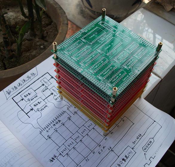 這個設計的技術(shù)牛人是一個游戲開發(fā)者,他從2007年就開始了這個計劃并命名為BMOW-1號,他的DIY電腦CPU面積約有450平方厘米,是個極其復雜的大塊頭:基礎是一塊Augat繞線板,在此之上已經(jīng)預先裝好了1250個針腳,需要手工給它們鍍金,然后連接2500條線,有些地方甚至要堆疊十層。