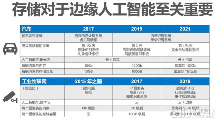 人工智能技術(shù)應(yīng)用到自動(dòng)駕駛領(lǐng)域的大部分發(fā)生在云端,車(chē)是信息傳載者,車(chē)接受信息后作出初步推理,將信息傳輸?shù)皆粕?,通過(guò)云端的深度學(xué)習(xí)做出判斷再傳回,之后人工智能的決策將作用于車(chē)本身。所以隨著未來(lái)在車(chē)內(nèi)進(jìn)行計(jì)算和存儲(chǔ)需求越來(lái)越多,單輛車(chē)上對(duì)于存儲(chǔ)需求量會(huì)增大。
