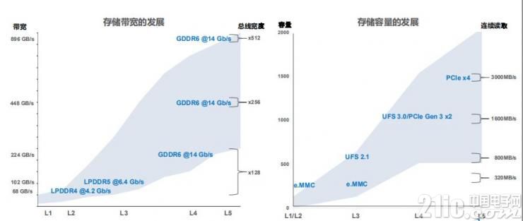 上圖介紹了在自動(dòng)駕駛L1-L5不同階段對(duì)于內(nèi)存和存儲(chǔ)產(chǎn)品需求的變化情況,L1、L2級(jí)別的自動(dòng)駕駛大多數(shù)需求能夠由LPDDR4來(lái)滿足,而隨著技術(shù)要求越來(lái)越高,這個(gè)需求未來(lái)更多將會(huì)由LPDDR5和GDDR6產(chǎn)品來(lái)滿足更高的計(jì)算性能。過(guò)去很多產(chǎn)品用在圖像處理、游戲和消費(fèi)領(lǐng)域,現(xiàn)在對(duì)于產(chǎn)品進(jìn)行升級(jí)、尤其是GDDR6來(lái)支持全新場(chǎng)景。右邊這個(gè)圖是存儲(chǔ)產(chǎn)品(容量)的需求量情況,現(xiàn)在基本上e.MMC產(chǎn)品對(duì)于現(xiàn)有應(yīng)用需求滿足情況還是不錯(cuò),基本上可以滿足8G到64G到128G的容量。未來(lái)對(duì)于存儲(chǔ)的尤其寫(xiě)入速率、容量要求和性能的要求越來(lái)越高,會(huì)從e.MMC轉(zhuǎn)到UFS再轉(zhuǎn)到PCle。汽車(chē)這個(gè)領(lǐng)域是兩條腿走路,NAND、DRAM齊頭并進(jìn)。