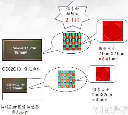 2.9um大像素設(shè)計(jì)使得OS02C10像素面積增大2.1倍
