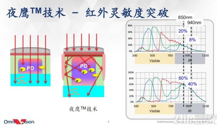 在紅外光850nm的時(shí)候,從原來(lái)20%提到60%。940nm時(shí)從8%提到40%。效率提升了,補(bǔ)光就減少很多,從而減少了很多補(bǔ)光的成本。