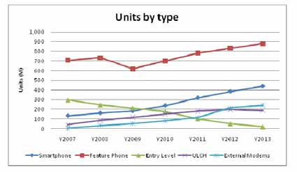 據馬春奇介紹,飛兆半導體在MCCC市場特別專注于手機、計算和多媒體應用。以手機為例,iSuppli最新數據顯示,2009年手機市場的付運量超過12億部,智能手機預計到2012年將超過3.84億部。
