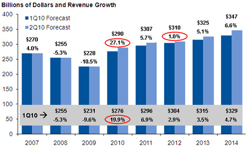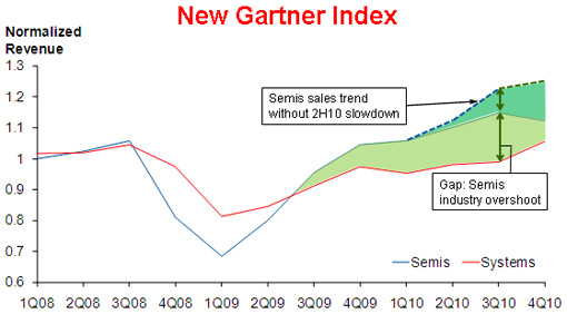 Lewis認(rèn)為全球經(jīng)濟(jì)以及多數(shù)半導(dǎo)體產(chǎn)品銷售的全面復(fù)蘇改善了半導(dǎo)體市場(chǎng)環(huán)境。過(guò)去5個(gè)季度的半導(dǎo)體環(huán)比增長(zhǎng)十分強(qiáng)勁,遠(yuǎn)超過(guò)季節(jié)性因素,而且產(chǎn)能趨緊。不過(guò),半導(dǎo)體收入的增長(zhǎng)顯然超過(guò)了系統(tǒng)收入的增長(zhǎng),這一點(diǎn)值得擔(dān)憂。Gartner對(duì)2010年下半年半導(dǎo)體行業(yè)的最新預(yù)測(cè)低于平均水平,因?yàn)殡娮酉到y(tǒng)銷售額預(yù)計(jì)將對(duì)整個(gè)半導(dǎo)體市場(chǎng)的銷售額起到一定的修正作用。