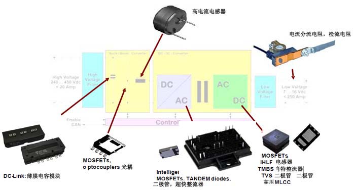 以混合動力汽車為例,預計至2012年,混合動力汽車的年均增長率可達20%。在混合動力汽車中的實現(xiàn)的新功能包括:逆變器、先進的電機控制和電池管理。Vishay可為混合動力應用提供定制和通用的核心器件,如薄膜電容器模塊、IGBT模塊、分流和放電電阻、MOSFET和SSR等,如下圖所示。在電動車的使用過程中,電池的充電時間非常關鍵,能否快速完成對電池的充電關系著消費者能否更早的接受這種新能源車。由于Vishay的逆變器方案具有可定制、開關和熱性能方面的優(yōu)勢。采用Vishay逆變器方案的一款比亞迪汽車能夠實現(xiàn)10分鐘充電80%的高效率,和消費者在加油站等待的時間相當。