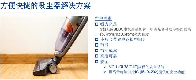 基于RL78/G1F的便攜吸塵器,該方案中RL78/G1F支持120度傳導控制以實現(xiàn)電機高速旋轉,RL78/G1F可以檢測過流狀況,快速保護電機控制電路,RL78/G1F包括了增強的電機控制模擬功能,配備了多種電壓保護和可選過流保護,在保證安全的同時降低了BOM成本。滿足了用戶對便攜式吸塵器的三大需求:高速運轉電機,安全性,低成本。