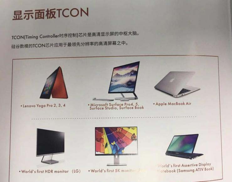 TCON(Timing Controller)芯片是高清顯示屏的中樞大腦,硅谷數(shù)模的TCON芯片應(yīng)用于最領(lǐng)先分辨率的高清屏幕之中,像聯(lián)想、微軟、LG、戴爾、蘋果、三星等筆記本顯示器都采用了硅谷數(shù)模的TCON產(chǎn)品。