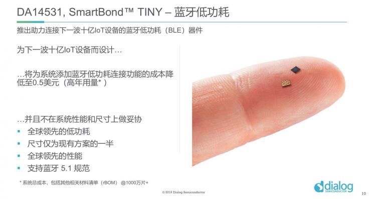 為了方便一些在無線連接設(shè)計(jì)上能力不夠的中小用戶,除了芯片,Dialog半導(dǎo)體還將推出SmartBond TINY模塊,該模塊結(jié)合了DA14531主芯片的各項(xiàng)功能,無需用戶再去驗(yàn)證其平臺,有助于客戶輕松簡單地將藍(lán)牙功能添加到他們的產(chǎn)品中,從而節(jié)省了產(chǎn)品開發(fā)的時(shí)間、工作量和成本。延續(xù)了DA14531芯片的低成本性能,該SmartBond TINY模塊的成本降低至1美元以下,大大降低了為系統(tǒng)添加SmartBond TINY的門檻。